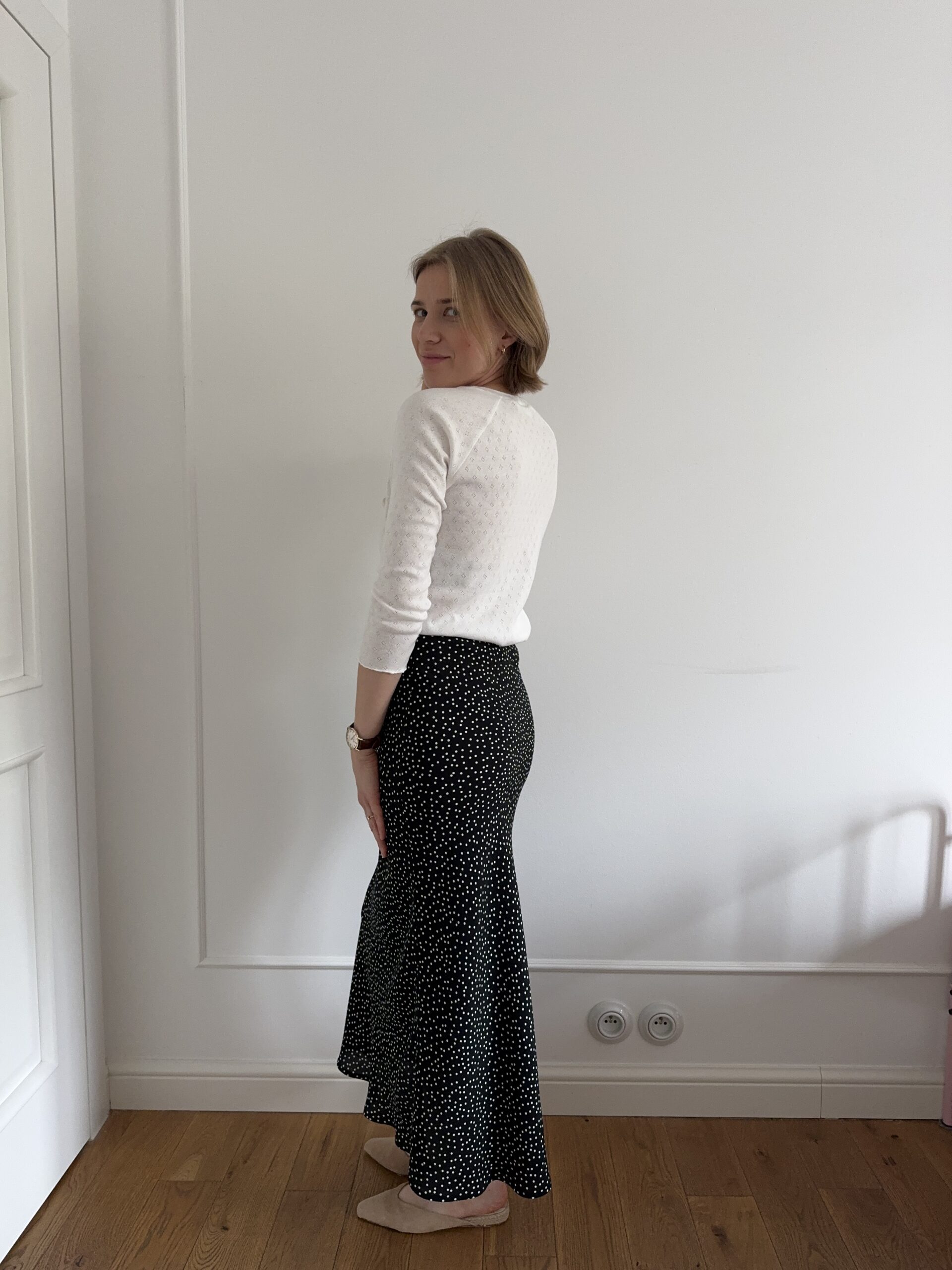 Z topem i sandałami – spódnica pięknie pracuje w ruchu i nadaje stylizacji swobodnego charakteru.