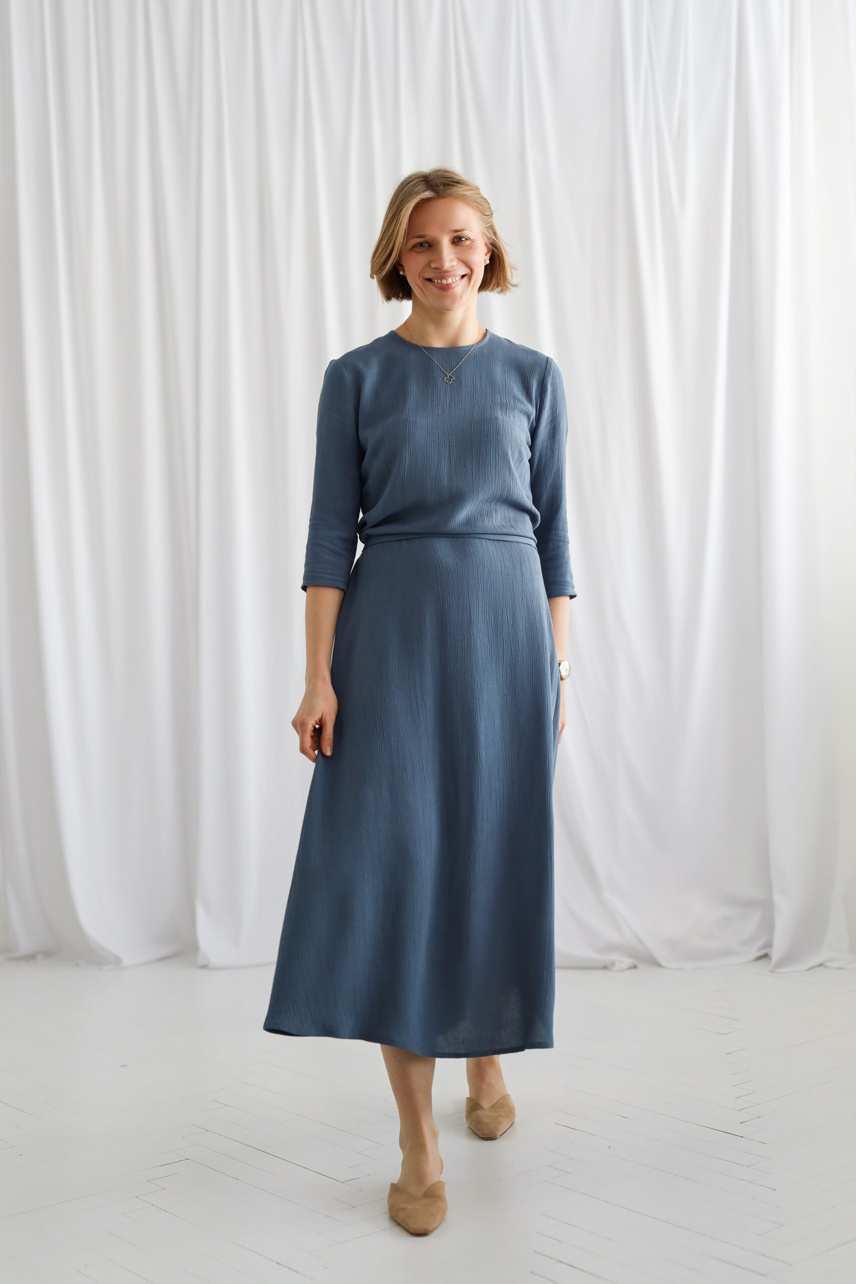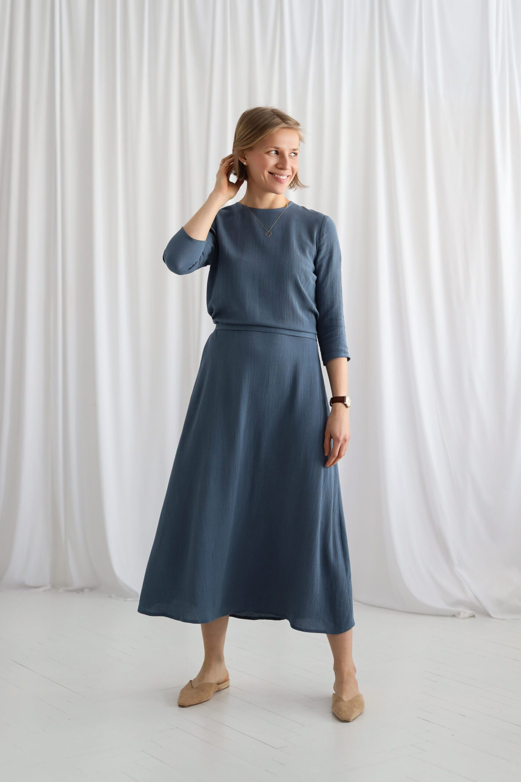 Dół w kształcie litery A pięknie układa się na sylwetce i nadaje lekkości każdemu ruchowi. Naturalna, kreszowana tkanina (85% wiskoza, 15% len) jest oddychająca, przyjemna dla skóry i szlachetnie „płynie” podczas chodzenia. Jej delikatna struktura dodaje całości miękkości i subtelnej głębi koloru.