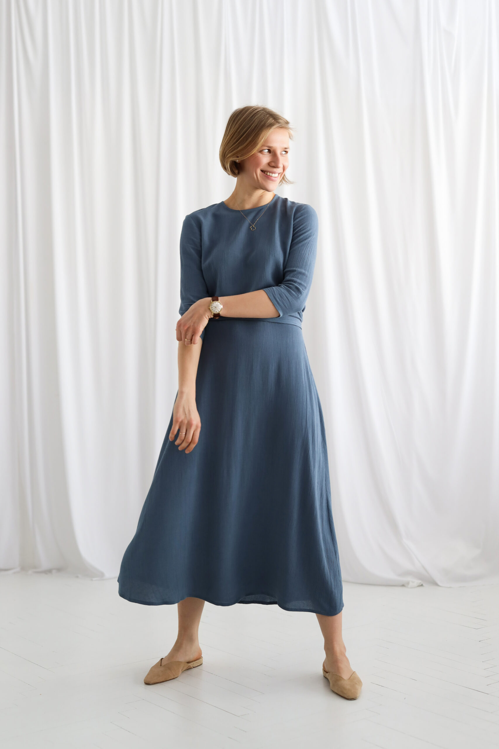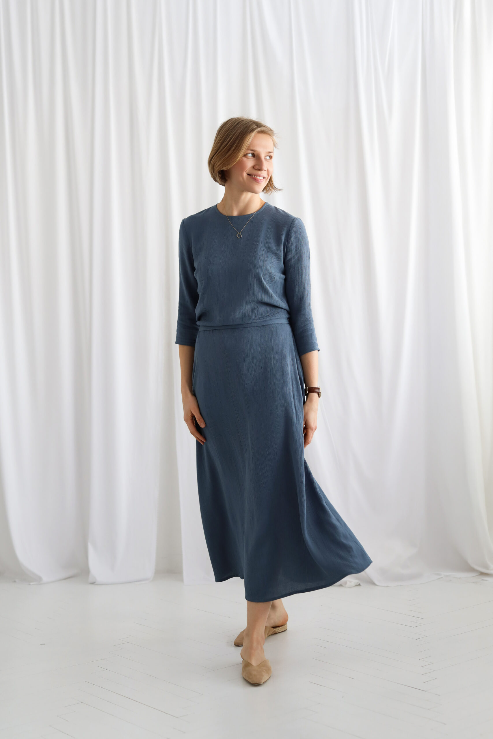 Rękaw 3/4 nadaje modelowi uniwersalności, a długość midi podkreśla proporcje sylwetki i ponadczasowy charakter kroju.